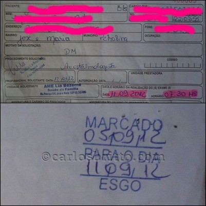 solicitação exameVeja até que ponto chega o descaso do poder público municipal com a saúde da população…faz um ano e cinco meses (12/03/12) que foi feita uma consulta na AME Lia Bezerra pelo médico, solicitado para exame com um oftalmologista.