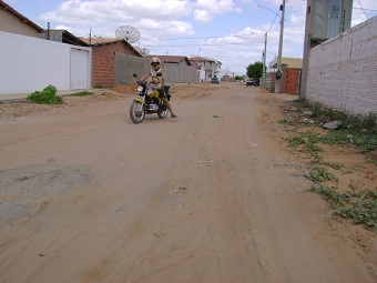 “Decidi mandar-lhe as fotos que tirei do bairro como ficou depois que tentaram fazer o saneamento. Digo tentaram porque não concluíram ainda. Tá impossível andar até mesmo de carro no bairro com areia fofa e espalhada, de moto. Deus me livre, temos que andar de pernas abertas, como se vê na foto. Gostaríamos de providências ou da empresa que fez o serviço, ou até mesmo da prefeitura”.