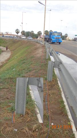 Os fios estão em contato com a estrutura metálica, o guardrail, proteção lateral da pista.