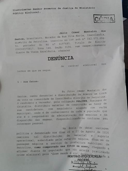 O vereador eleito por Petrolina, Domingos de Cristália (PSL), foi denunciado ao Ministério Público de Pernambuco (MPPE), ao Tribunal Regional Eleitoral (TRE-PE) e à Polícia Civil pelo líder comunitário do distrito de Izacolândia (zona rural da cidade), Júlio César Monteiro dos Santos (foto), por suposta compra de votos. (veja aqui)