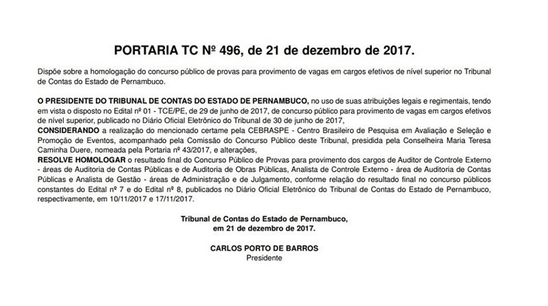 Realizado em julho deste ano, o concurso do Tribunal de Contas do Estado de Pernambuco (TCE-PE) foi homologado em publicação do Diário Oficial do Estado da última sexta-feira (22). A portaria foi assinada pelo presidente do órgão, conselheiro Carlos Porto. O certame teve objetivo de preencher 36 vagas iniciais de ensino superior.