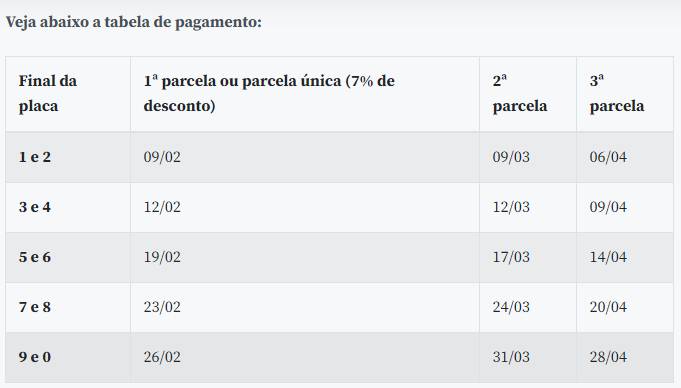 O pagamento do IPVA pode ser feito de uma só vez, com desconto de 7% ou em três parcelas consecutivas (sem o desconto), com as datas de vencimento escalonadas de acordo com o final de placa. O vencimento da cota única ou da primeira parcela ocorre no dia 9 de fevereiro para os veículos com final de placa 1 e 2.