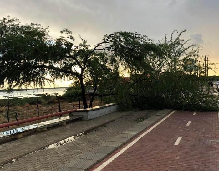 Na Avenida Cardoso de Sá, uma árvore caiu e ficou atravessada no calçadão. Já no Aeroporto Internacional Senador Nilo Coelho, uma das placas que dividem o estacionamento de veículos não resistiu à força do vendaval e despencou em cima de alguns carros.