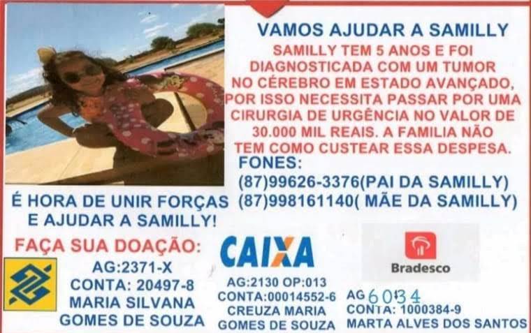 O problema é que sua família não dispõe dos R$ 30 mil necessários para o procedimento, e iniciou uma campanha para arrecadar fundos em prol da menina. Todos os detalhes para quem quiser ajudar Samilly podem ser acessados abaixo: