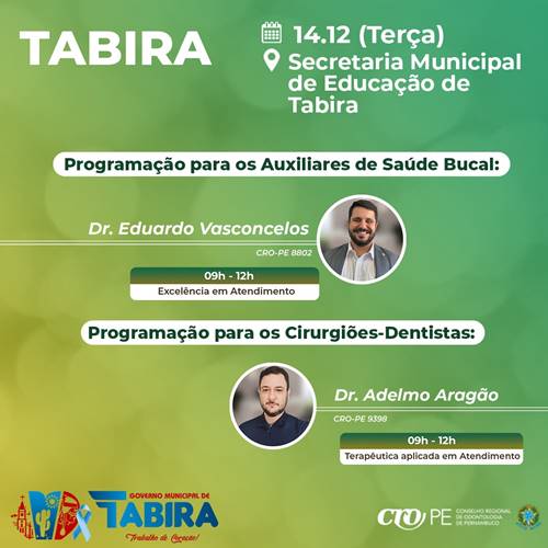 Em Tabira (PE), Sertão do Pajeú, o Conselho Regional de Odontologia de Pernambuco (CRO-PE) vai realizar um ciclo de capacitação nesta terça-feira (14). O evento, gratuito e voltado para os cirurgiões-dentistas e os auxiliares de saúde bucal, visa a promover o bem-estar bucal no município.