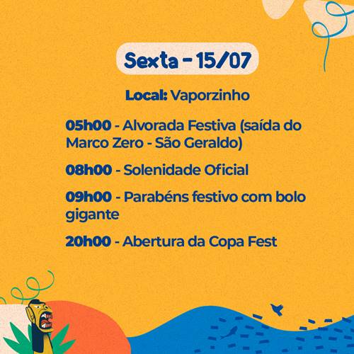 Também nesta sexta-feira acontecerá a abertura oficial da 1ª Copa Fest na Orla II, às 20h, com shows das bandas Timbalada, Afrodisíaco, Voa Voa, Dennes Caffé, Banda Mirage, além dos parabéns a Juazeiro reforçado com um show pirotécnico.