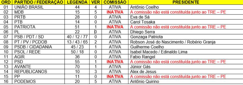 Abaixo estão os partidos ativos (com comissão executiva municipal constituída junto ao TRE-PE), e os inativos (cuja comissão executiva municipal ainda não foi constituída), os seus respectivos presidentes e a quantidade de vereadores de mandatos por partido até o momento.