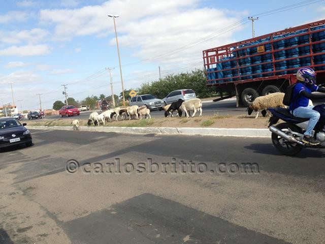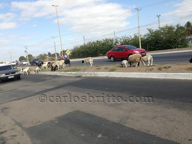 Nas fotos, percebe-se que as ovelhas e carneiros procuram o mato às margens da avenida para se alimentarem, a ponto de provocarem algum acidente ou mesmo morrerem atropelados. Uma irresponsabilidade que só vai ter fim quando os donos dos animais sentirem a multa no bolso, sem pena.