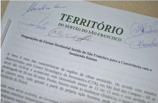 Foto 01Durante a Assembleia Itinerante da Bahia realizada em Juazeiro no último dia 04, o Fórum de Desenvolvimento Territorial, que esteve reunido nos dias 02 e 03, entregou aos membros da Comissão de Meio Ambiente, Seca e Recursos Hídricos, documento com propostas para a Convivência com o Semiárido baiano, tomando como referência o período de estiagem prolongada pelo qual o estado vem passando.