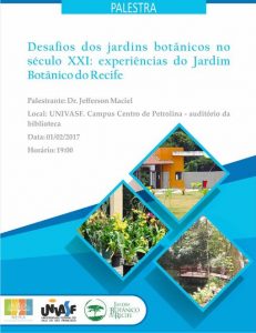 O Núcleo de Ecologia e Monitoramento Ambiental da Universidade Federal do Vale do São Francisco (Univasf) promoverá uma palestra nesta quarta-feira (1º/02), no Auditório da Biblioteca do Campus Petrolina Centro, sobre a revitalização do Jardim Botânico do Recife.