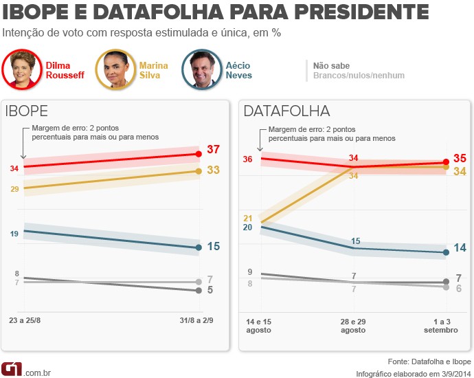 Pesquisas Ibope e Datafolha divulgadas nesta quarta-feira (3) mostram que as candidatas Dilma Rousseff (PT) e Marina Silva (PSB) estão empatadas tecnicamente na corrida para a Presidência da República. A margem de erro das duas pesquisas é de dois pontos percentuais, para mais ou para menos.