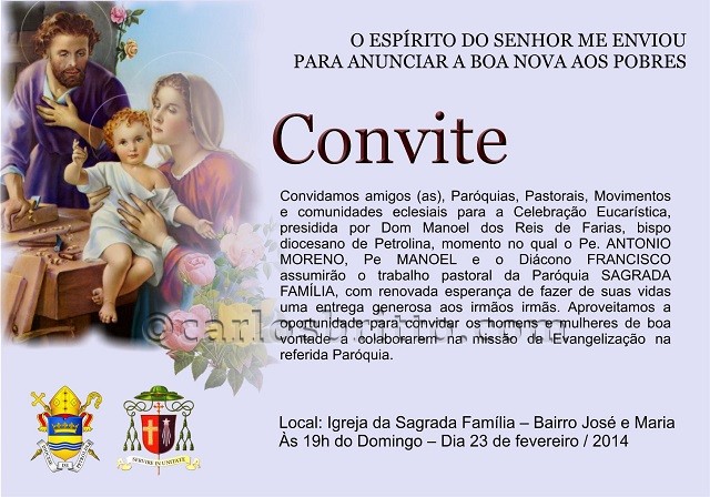 A Diocese de Petrolina, em solenidade presidida pelo seu bispo, Dom Manoel dos Reis Farias, empossa hoje os padres Antonio Moreno, Manoel e o diácono Francisco na Paróquia da Sagrada Família, no bairro José e Maria.