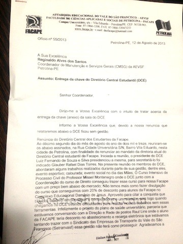 Ao menos é o que mostra o ofício 55/2013 (acima), enviado ao coordenador de Serviços Gerais da Facape, Reginaldo Alves dos Santos, entregando as chaves da sala do DCE e prestando contas do material em seu interior.