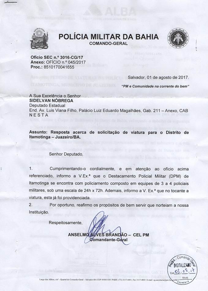 Após a Secretaria de Segurança Pública do Estado (SSP-BA) analisar o pedido do parlamentar, o comandante-geral da PM-BA, coronel Anselmo Brandão, informou, por meio do ofício nº 3016-CG17 (veja aqui), que o veículo já foi providenciado.