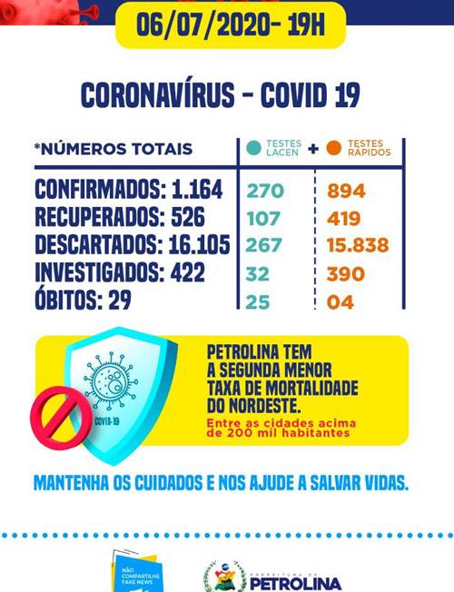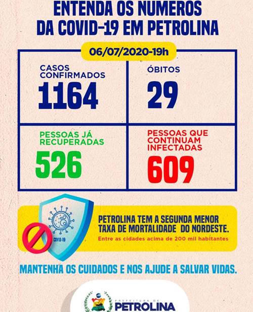 Petrolina contabiliza mais uma morte, totalizando 29. O paciente tinha 84 anos e faleceu no dia 20 de junho, no Hospital Universitário (HU). A Declaração de Óbito (DO) saiu como residente no município de Dormentes (PE), mas após investigação, constatou-se que o idoso residia em Petrolina.