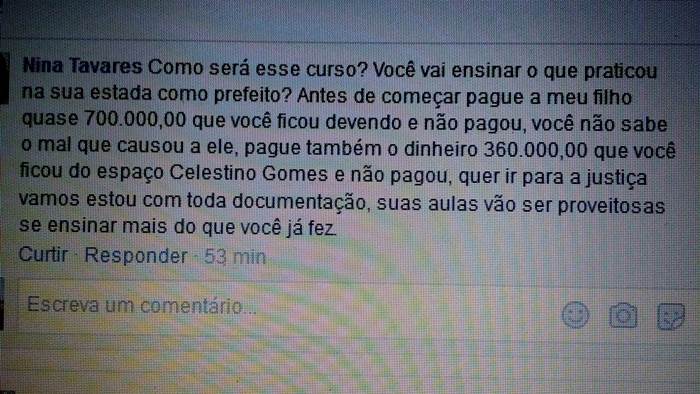 “Como será esse curso? Você vai ensinar o que praticou na sua estada como prefeito? Antes de começar, pague a meu filho quase R$ 700 mil que você ficou devendo e não pagou. Você não sabe o mal que causou a ele. Pague também o dinheiro, R$ 360 mil, que você ficou do Espaço Celestino Gomes e não pagou. Quer ir à justiça? Então vamos. Estou com toda a documentação. Suas aulas vão ser proveitosas se ensinar mais do que você já fez”, declarou Dona Nina. O Blog reserva espaço ao ex-prefeito, caso desejar rebater as críticas. (Fotos/reprodução WhatsApp)