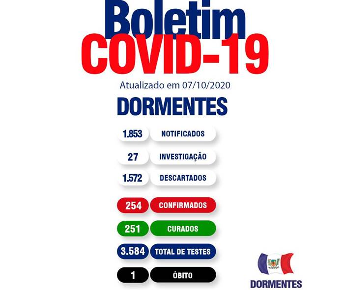Dormentes está com 254 infectados pela doença, 251 curas clínicas e um óbito. A Secretaria de Saúde orienta a população para que mantenha os cuidados essenciais, como uso de máscara e distanciamento social. Em caso de febre, tosse seca, cansaço, perda de paladar ou olfato ou outros sintomas, a pessoa deve procurar o Hospital Municipal para a realização de exames.