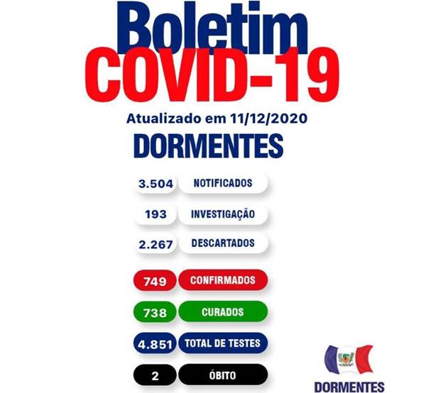 De acordo com o boletim, Dormentes está com 749 casos confirmados, 738 curas e dois óbitos. A pasta reforça à população a manter os cuidados essenciais como uso da máscara, álcool em gel e o distanciamento social. Em caso de febre, tosse seca, cansaço, perda de paladar ou olfato e outros sintomas associados, a pessoa deve procurar a Unidade Básica de Saúde (UBS) mais próxima ou a Policlínica, das 8h às 12h, e em casos de urgência o Hospital Municipal para a realização de exames.