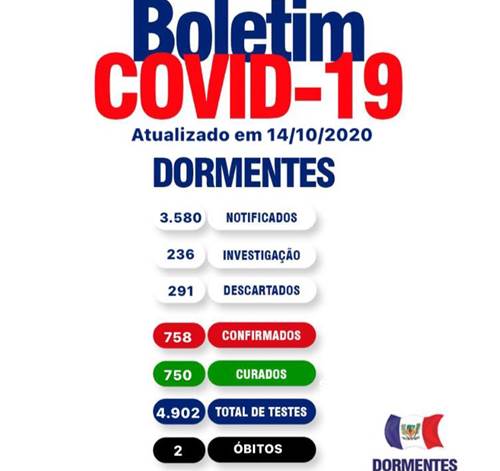 Com os novos números Dormentes tem agora 758 infectados, 750 curas e dois óbitos. A secretaria de Saúde reforça à população para manter os cuidados essenciais, como uso da máscara, álcool em gel e o distanciamento social. Em caso de febre, tosse seca, cansaço, perda de paladar ou olfato e outros sintomas associados, a pessoa deve procurar a Unidade Básica de Saúde (UBS) mais próxima ou a Policlínica, das 8h às 12h, e em casos de urgência o Hospital Municipal, para a realização de exames.