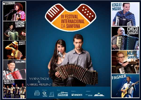 Vanina e Gabriel estarão no centro de cultura no dia 15, a partir das 20h, e se juntarão ao elenco de artistas confirmados – Oswaldinho, Renato Borghetti, Mestrinho, Chico Chagas, Nelson Faria, Edglei Miguel, Quinteto Sanfônico da Bahia, Targino Gondim (curador do evento), o americano Murl Sanders e o cantor Fagner. Este último encerará no sábado (16) o 4° Festival Internacional da Sanfona.