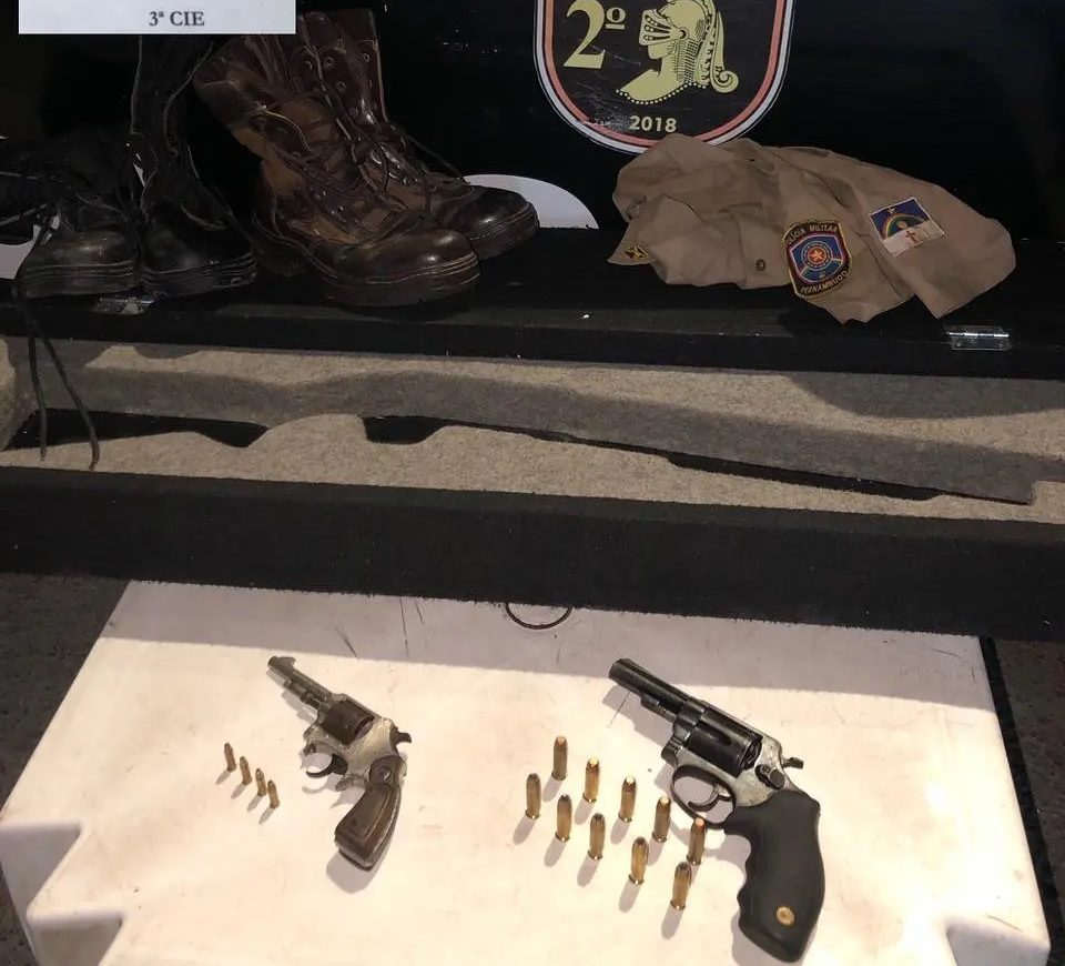 Ao avistarem o policiamento, os suspeitos ainda tentaram fugir, mas foram alcançados pelos militares. Com eles, foram encontrados revólveres e munições e fardamentos da polícia, provavelmente para a prática de crimes.