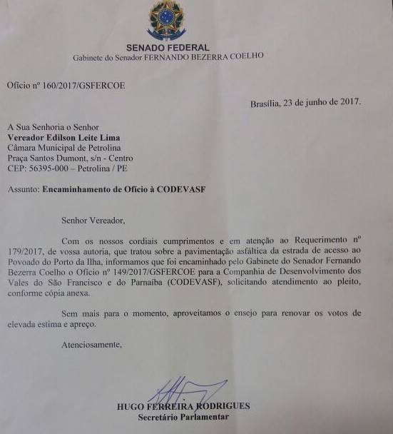 É que o senador encaminhou o ofício de Edilsão à Companhia de Desenvolvimento dos Vales do São Francisco e Parnaíba (Codevasf). Agora, é aguardar os próximos capítulos.