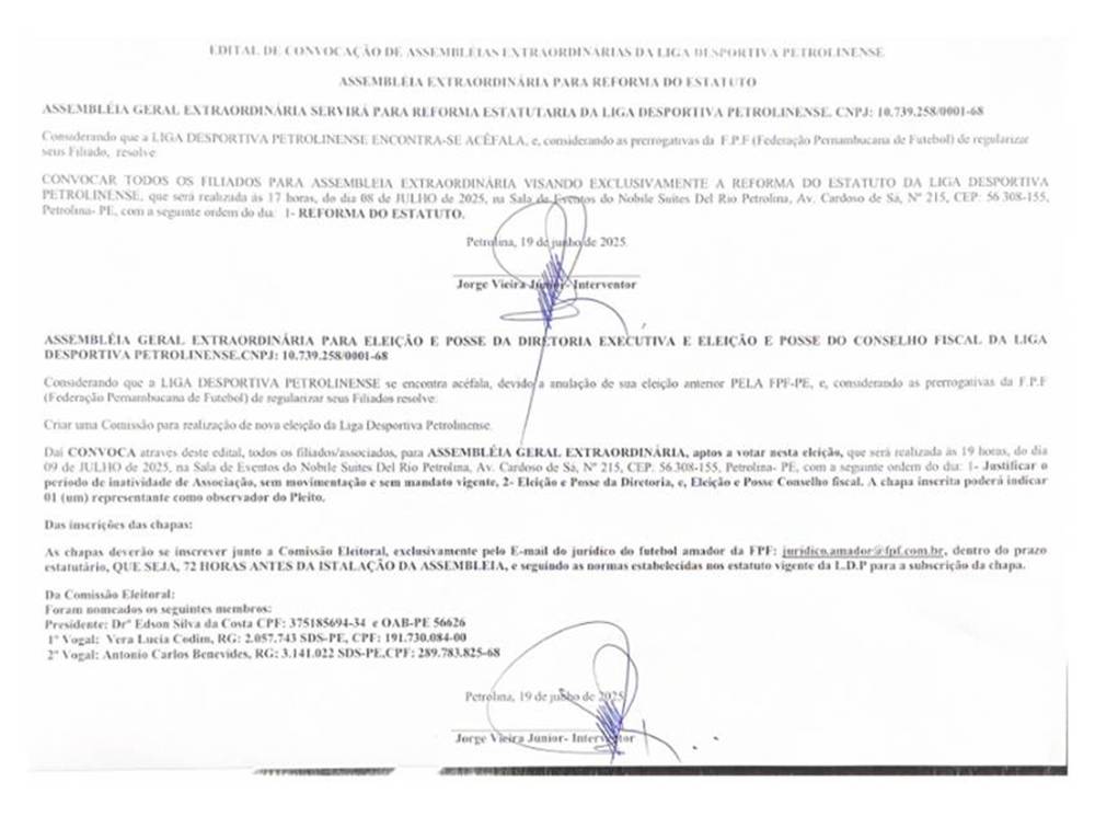 A Liga Desportiva Petrolinense (LDP) está convocando todos os seus filiados para uma Assembleia Geral Extraordinária (AGE), a ser realizada no próximo dia 8 de julho, às 17h, na Sala de Eventos do Nobile Suites Del Rio.