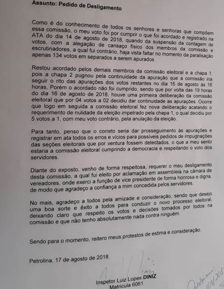 Este Blog teve acesso a um comunicado oficial do vice-presidente da comissão eleitoral do pleito, Inspetor Luiz Lopes Diniz, está pedindo seu desligamento da comissão. Diniz foi contrário tanto à suspensão da contagem de votos, na terça-feira (14), quando ocorreu o pleito, como também discordou da anulação da eleição – proposta pela Chapa 1 e acatada pela maioria dos integrantes da comissão.
