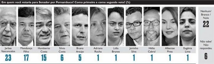 Na pesquisa eleitoral divulgada nesta quarta-feira (15), realizada pelo Ipespe em parceria com a Folha de Pernambuco, em um cenário apertado na disputa por vagas no Senado, o deputado federal Jarbas Vasconcelos (MDB) está na frente com 23% das intenções de votos, seguido pelo também deputado federal Mendonça Filho (DEM), que aparece com 17%. Na sequência, o senador Humberto Costa registra 15%, enquanto o deputado federal Sílvio Costa (Avante) aparece com 6% e o deputado federal Bruno Araújo (PSDB) com 5%.