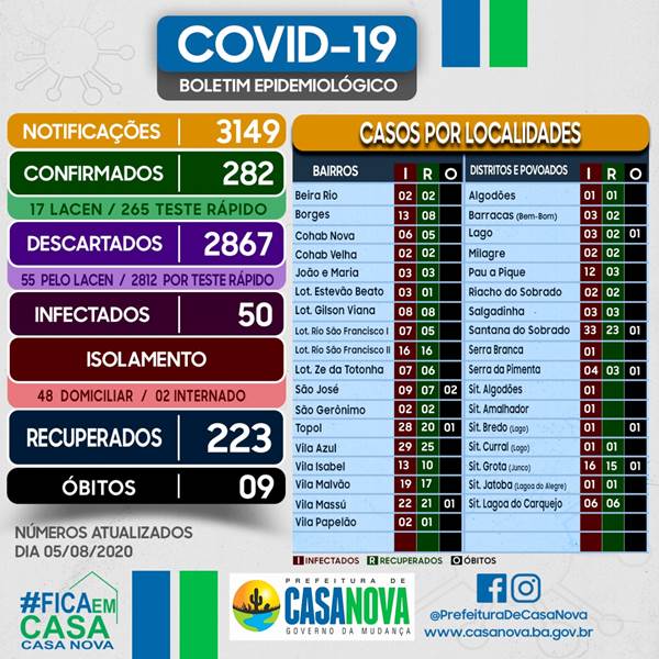 O boletim trouxe 3.149 notificações, sendo descartadas 2.867. Dos 282 casos confirmados, 50 ainda estão com o vírus ativo e, destes, dois permanecem internados. Os outros 48 encontram-se em isolamento domiciliar, acompanhados pelas equipes de saúde. Até o momento Casa Nova registra 9 óbitos causados pela doença.
