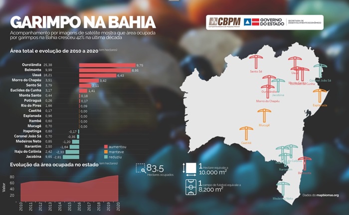 Dados reunidos pelo Projeto de Mapeamento Anual do Uso e Cobertura da Terra no Brasil (MapBiomas), mostram que a área da atividade garimpeira na Bahia registrou um aumento de 42% de 2010 a 2020, com destaque para os municípios de Ourolândia, Belmonte e Uauá, que representaram as maiores altas. No Brasil, a área de garimpo foi superior à mineração industrial em 2020: 107.800 hectares contra 98.300, respectivamente.