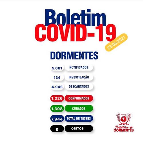 O boletim divulgado nesta quarta mostra que Dormentes está com 10 casos ativos da Covid-19 e 134 em investigação. O município tem 1.326 casos confirmados, sendo 1.308 curas clínicas e 8 óbitos.