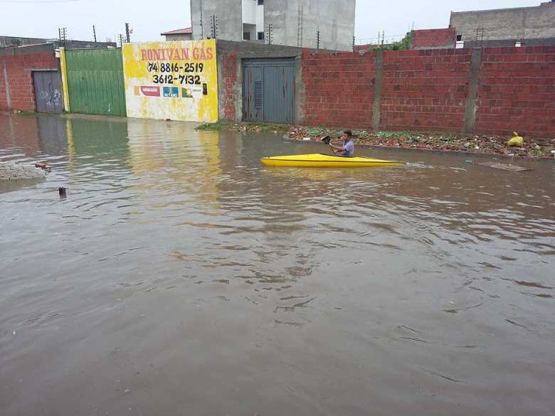 As chuvas de ontem (18) provocaram uma cena curiosa em Juazeiro (BA). No Bairro Maringá, um comunitário utilizou um caiaque para sair de casa, por conta das ruas alagadas.