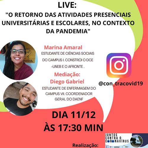 A discussão abordará as incertezas, impactos e implicações do retorno das atividades no contexto da pandemia. A estudante de Ciências Sociais do Campus I da Uneb, Marina Amaral, é a convidada da live, que será mediada pelo estudante de Enfermagem do Campus VII, Diego Gabriel. A live é destinada a todos os envolvidos com a educação, especialmente, os que atuam no território de Senhor do Bonfim e região.