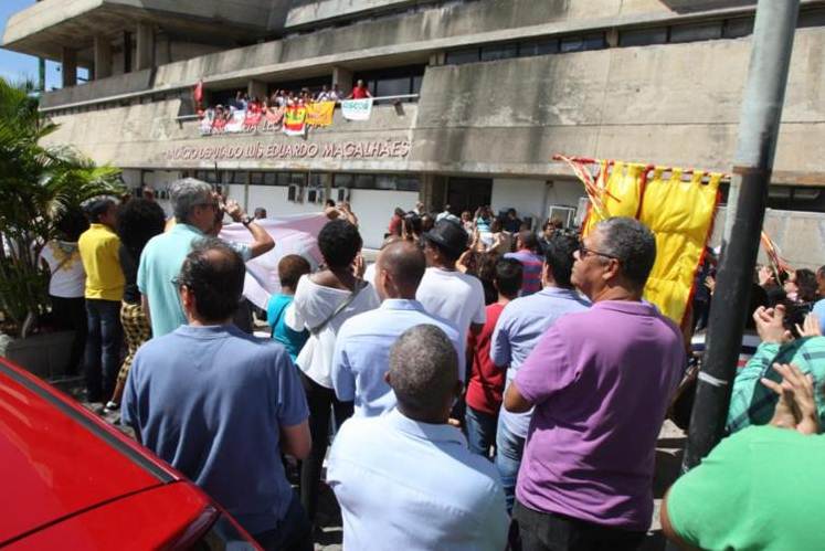 PMs cercaram nesta manhã a ALBA, no Centro Administrativo da Bahia (CAB), impedindo que os manifestantes entrassem no prédio. Eles tentaram evitar que confusões como as desta terça voltem a ocorrer, como a quebra de uma das portas de vidro que dava acesso ao plenário. Ainda não se sabe se a pauta será votada hoje. (Fonte: Jornal A Tarde)