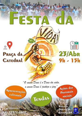 Um trabalho dedicado à solidariedade. Esse é o principal objetivo da ‘Festa da Vida’, organizada pela Diocese de Juazeiro (BA), que acontecerá neste domingo (23), a partir das 9h, na praça da Catedral. O evento será uma feira de exposição dos produtos das pastorais sociais e outros organismos que atuam pela defesa e promoção da vida. Tendas temáticas e manifestações culturais fazem parte da programação.