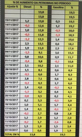Em julho deste ano, a Petrobras alterou o sistema de reajuste dos combustíveis (gasolina e diesel), passando a alinhar os preços nacionais segundo a variação do dólar e dos preços do barril de petróleo e seus derivados nos mercados internacional. Conforme anunciado pelos jornais de todo o país, entre aumento e diminuição, todos em pequenas proporções, de 04 de julho até 09 de novembro de 2017, os preços tiveram 85 variações na gasolina e 87 no diesel, acumulando alta de 27,4% na Gasolina e 25,8% no Diesel. Estes aumentos se deram nas Refinarias, isto é, na base da estrutura de comercialização de combustíveis.