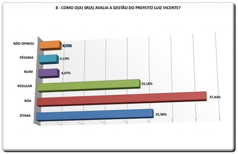 A maioria do eleitorado de Sobradinho avalia positivamente a gestão do atual prefeito Luiz Vicente. Para 37,43% é boa e 25,98% consideram ótima. Os que acham regular são 23,18%. Já entre aqueles que acham ruim, o índice é de 4,47%, e péssima 4,19%. Não opinaram 4,75%.