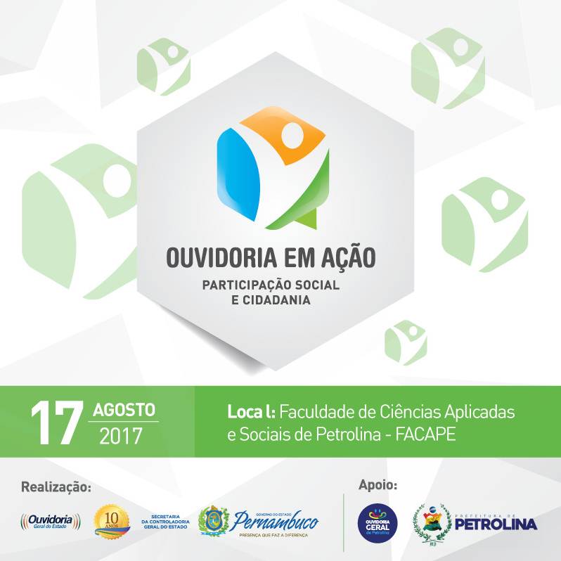 Estão abertas as inscrições para a 3° Encontro de Ouvidores de Pernambuco que acontecerá em agosto, em Petrolina. O evento será realizado no auditório da Faculdade de Ciências Aplicada e Sociais de Petrolina (Facape) e tem como objetivo promover a participação social, garantindo o exercício do direito à cidadania em todas as esferas do poder público. O encontro é promovido pela Ouvidoria-Geral (OGE-PE) e pela Secretaria da Controladoria-Geral do Estado de Pernambuco (SCGE-PE), e conta com o apoio da Prefeitura de Petrolina.