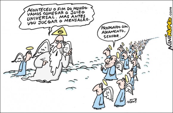 Até parece, pela interpretação que se tem da charge, que o Deus é o Gilmar Mendes e os demais, aqueles que rogam pelo adiamento do julgamento final, os Petistas.