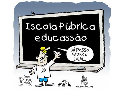 Cuidado. O autor dessa charge foi extremamente equivocado e infeliz.Escola pública não é isso.Temos a falta de investimentos do poder público: nos faltam bibliotecas em escolas, condições de trabalho, salário digno para o professor, uma carga horária que respeite o tempo para planejamentos, nos falta até o respeito da sociedade, a prova fiel é esta charge que de cômica não tem nada.temos vários problemas ,mas de uma coisa tenhamos certeza: temos alunos destaques e professores que não só recebem salário no final de mês,mas que lutam para que tenhamos uma sociedade justa e igualitária.deixemos de ser hipócritas.Charges como esta deveriam ser direcionadas para políticos que nada fazem para mudarem a escacês de investimentos na educação brasileira.Querem dizer que o país subiu de posição econômica somente porque seu povo está com um poder aquisitivo melhor: comprando veículos,viajando mais via aérea, ou seja,pela aquisição de bens materiais e etc, entretanto ,país desenvolvido é aquele que investe em educação e prepara-se para fazer a diferença quando se trata de pessoas civilizadas e construtoras de uma nova sociedade.