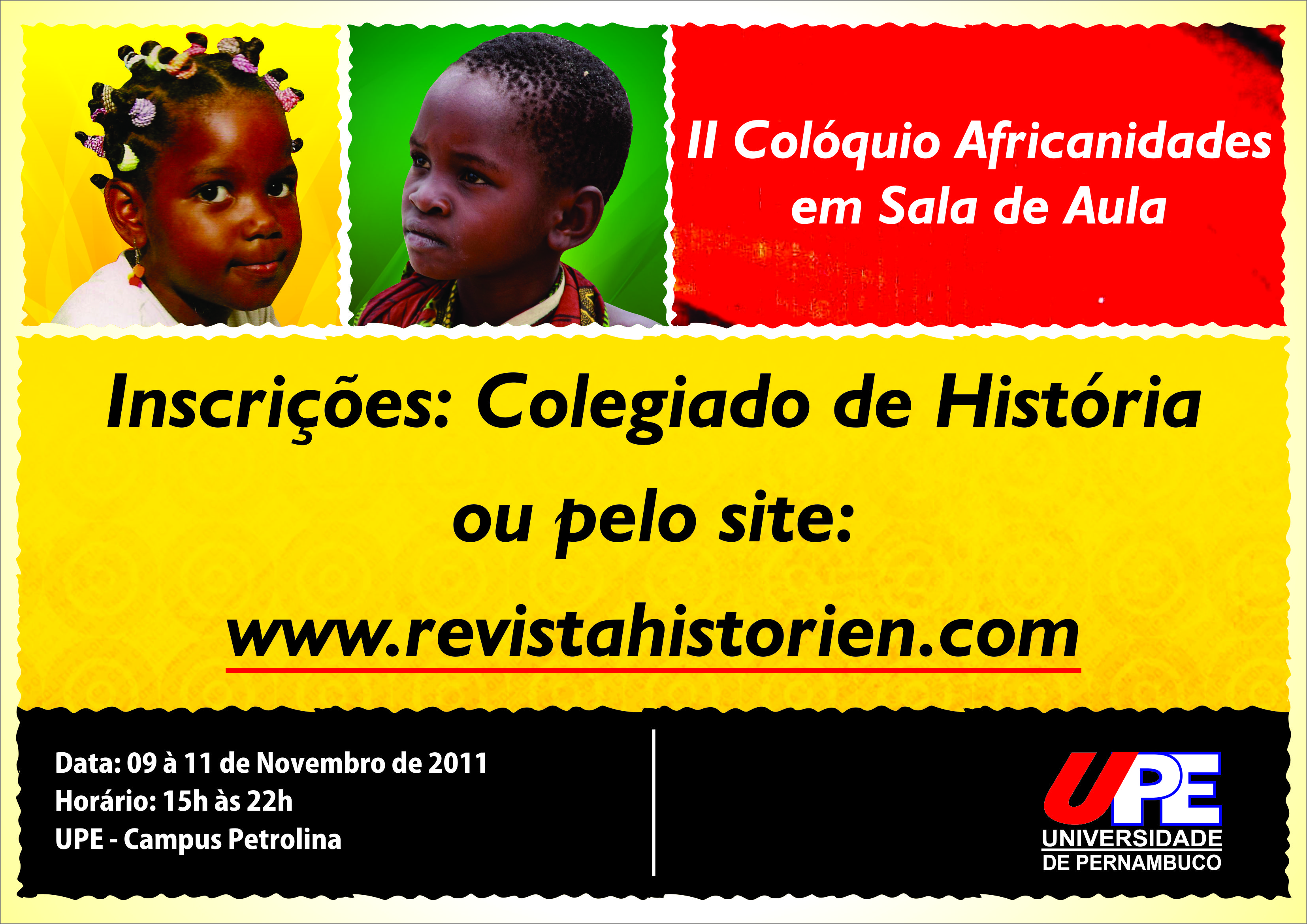 A UPE, através do colegiado do curso de História, vai realizar o 2º Colóquio Africanidades em Sala de Aula. O encontro é para discutir temas ligados à lei 10.639, que torna obrigatório o ensino de História da África nas escolas brasileiras. Vários pesquisadores debaterão temas como políticas afirmativas, História da África, Currículo escolar, culturas afrodescendentes, entre outros.