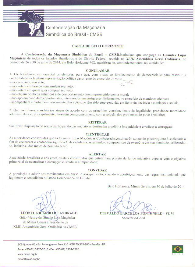 Uma iniciativa da Confederação da Maçonaria Simbólica do Brasil (CMSB), instituição que congrega as grande lojas maçônicas de todos os estados brasileiros e do Distrito Federal, quer levar o eleitorado do país a votar com consciência nas eleições deste ano.