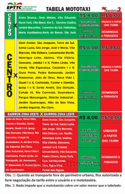 Segundo a assessoria de comunicação da prefeitura, a tabela foi criada com o intuito de informar as tarifas à população e coibir os abusos por parte dos mototaxistas. Os profissionais que não cumprirem com os valores estabelecidos estão sujeitos à multa e suspensão da permissão.