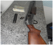 O primeiro suspeito, J.P.M, que mora na Agrovila 16 do Projeto Fulgêncio, admitiu aos policiais que tinha uma espingarda calibre 12, com registro vencido, em poder de C.J.G, residente na Agrovila 22. Ao chegarem ao segundo suspeito, a equipe encontrou a arma, a qual tinha o cano adulterado com um alongador. A dupla foi encaminhada à Delegacia de Polícia Civil (DPC) local. (Foto: 7ª CIPM/divulgação)