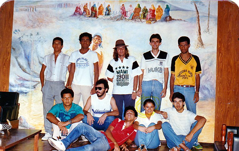 396337_166792323427927_1602722304_nEssa foto é de 1987. Foi tirada em frente ao painel pintado por Celestino Gomes na Emissora Rural …Em pé da esquerda para a direita: Adely de França, Sebastião César, Lucien Paulo, Moisés Almeida e Almir de Castro…Agachados: Wuinston Monteclaro, Edinaldo Barros, Carlos Britto (deitado) Lucimar e Paulo Dorian.
