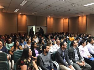 Mais de 130 inscritos, entre profissionais e estudantes da área de saúde, participaram da abertura do encontro. A primeira palestra foi do médico geriatra, Dr. Daniel Azevedo, sobre abordagem paliativa em pacientes com demência, detalhando desde o diagnóstico ao acompanhamento do processo de morrer.