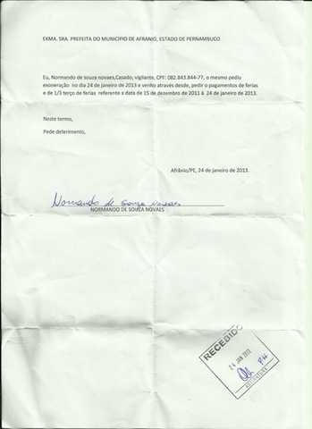 Eu era funcionário do município e pedi demissão no mês de janeiro do cargo de vigia efetivo. Logo depois, fiz um requerimento para receber as férias e também 1/3 de férias. Fiquei com uma cópia e a prefeitura com duas. O requerimento foi entregue no dia 24 de janeiro deste ano no setor de Recursos Humanos (RH) da prefeitura. Os funcionários me garantiram que iriam me pagar quando a prefeita liberasse, mas até hoje nada foi recebido.