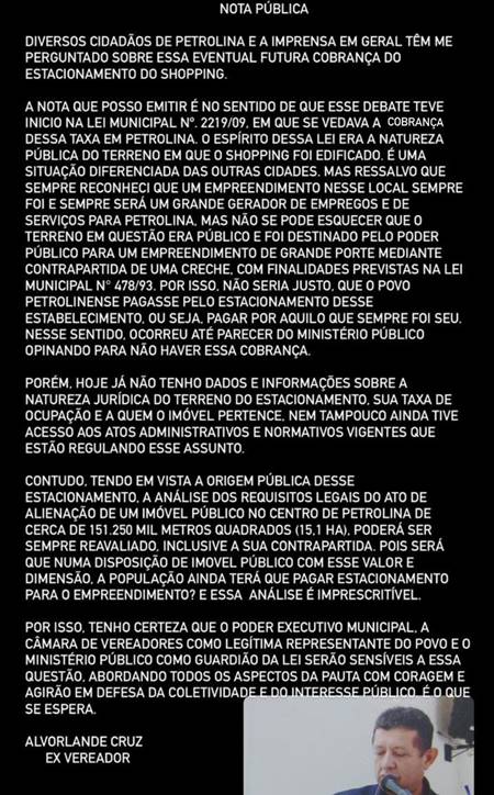 Ex-vereador de Petrolina e autor de um projeto de lei que derrubou a cobrança pelo estacionamento do River Shopping, Alvorlande Cruz se pronunciou sobre o retorno da taxa, anunciado pelo centro de compras a partir do próximo dia 2 de outubro. Por meio de nota, o ex-vereador explicou que esse debate foi iniciado em 2009, quando ele exercia mandato na Casa Plínio Amorim, a partir da Lei Municipal 2.219/09, pela qual se vedava a cobrança pelo fato de que o terreno onde o shopping foi construído é oriundo de doação da prefeitura.