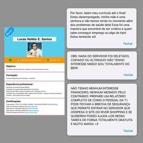 “Eu já deixei currículos em diversos lugares e não fui chamado. Sou programador e meu forte sempre foi segurança digital, por isso pensei nessa forma para chamar a atenção. Moro sozinho com minha mãe, que tem problemas de saúde e não temos quase renda alguma. Então, decidi fazer isso, mas nenhum item do servidor que mantém a página do River na internet foi deletado, alterado ou copiado”, garante.